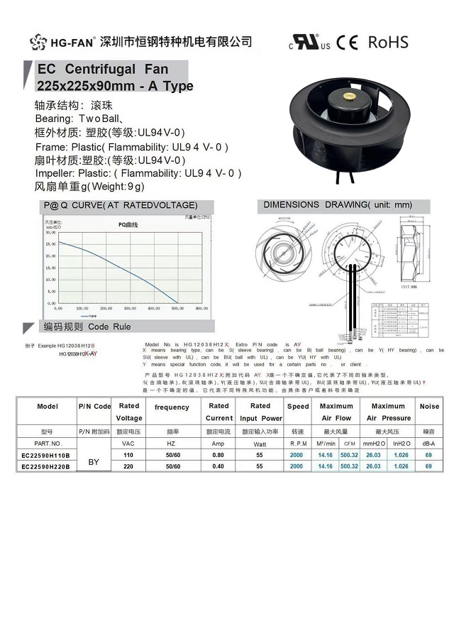 產(chǎn)品名稱:EC交流變頻后傾離心風扇225X99MM