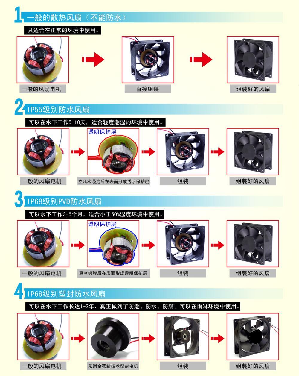 防水風(fēng)扇性能和工藝:采用國(guó)內(nèi)首創(chuàng)無刷馬達(dá)全密閉灌封工藝,核心器件如:PCBA板、馬達(dá)全部用進(jìn)品樹脂密封,采用此種灌封防水的優(yōu)點(diǎn)是:防水風(fēng)扇用于,與水、油、鹽堿、腐蝕物質(zhì)和環(huán)境接觸時(shí),可以高度防護(hù),防護(hù)等級(jí)可達(dá)到:IP55、IP68,保證防水風(fēng)扇能長(zhǎng)時(shí)間可靠工作而不會(huì)失效。